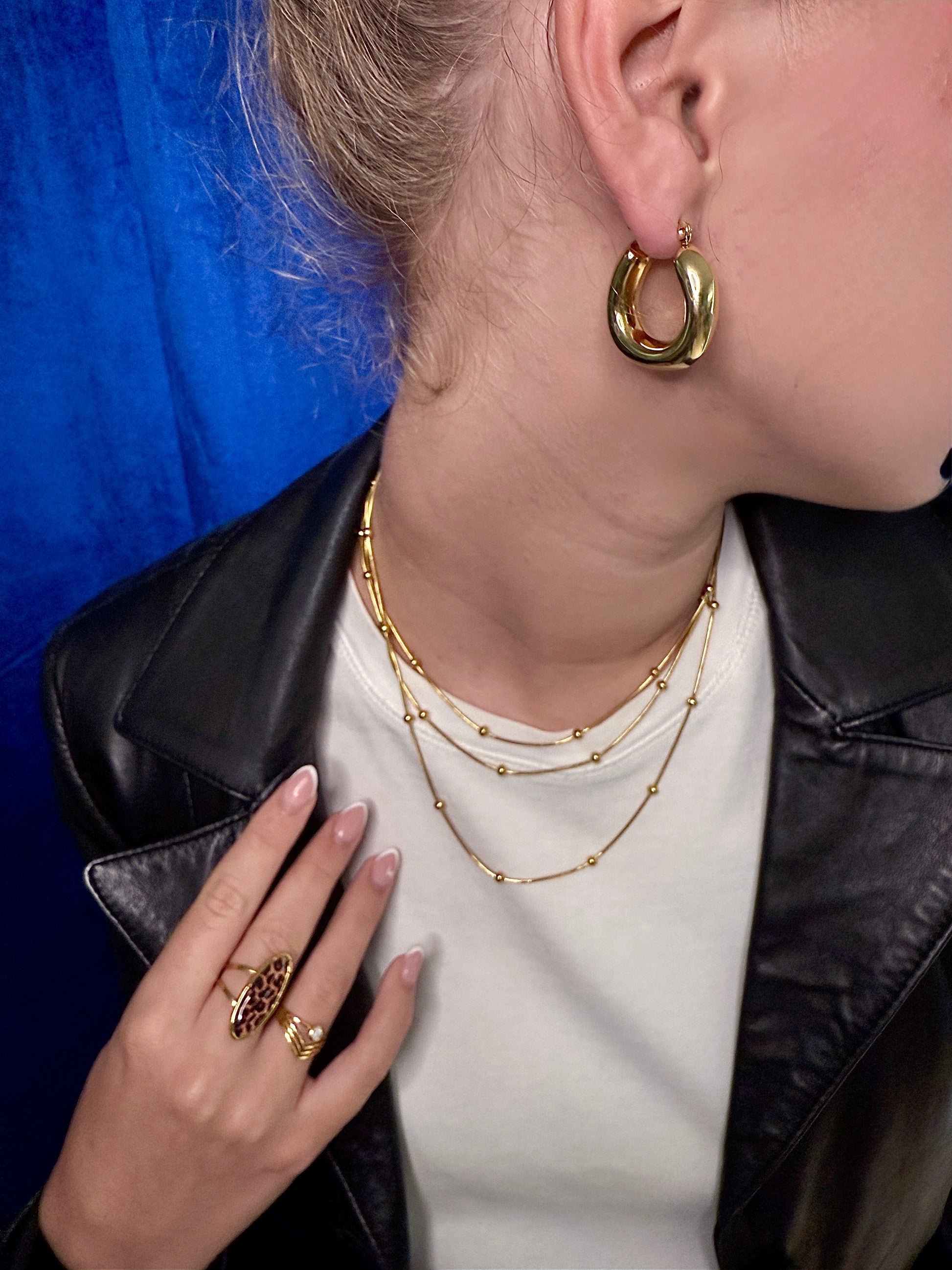 Cabochon allongé motif léopard sur anneau doré. – Ajustable. Acier chirurgical hypoallergénique.