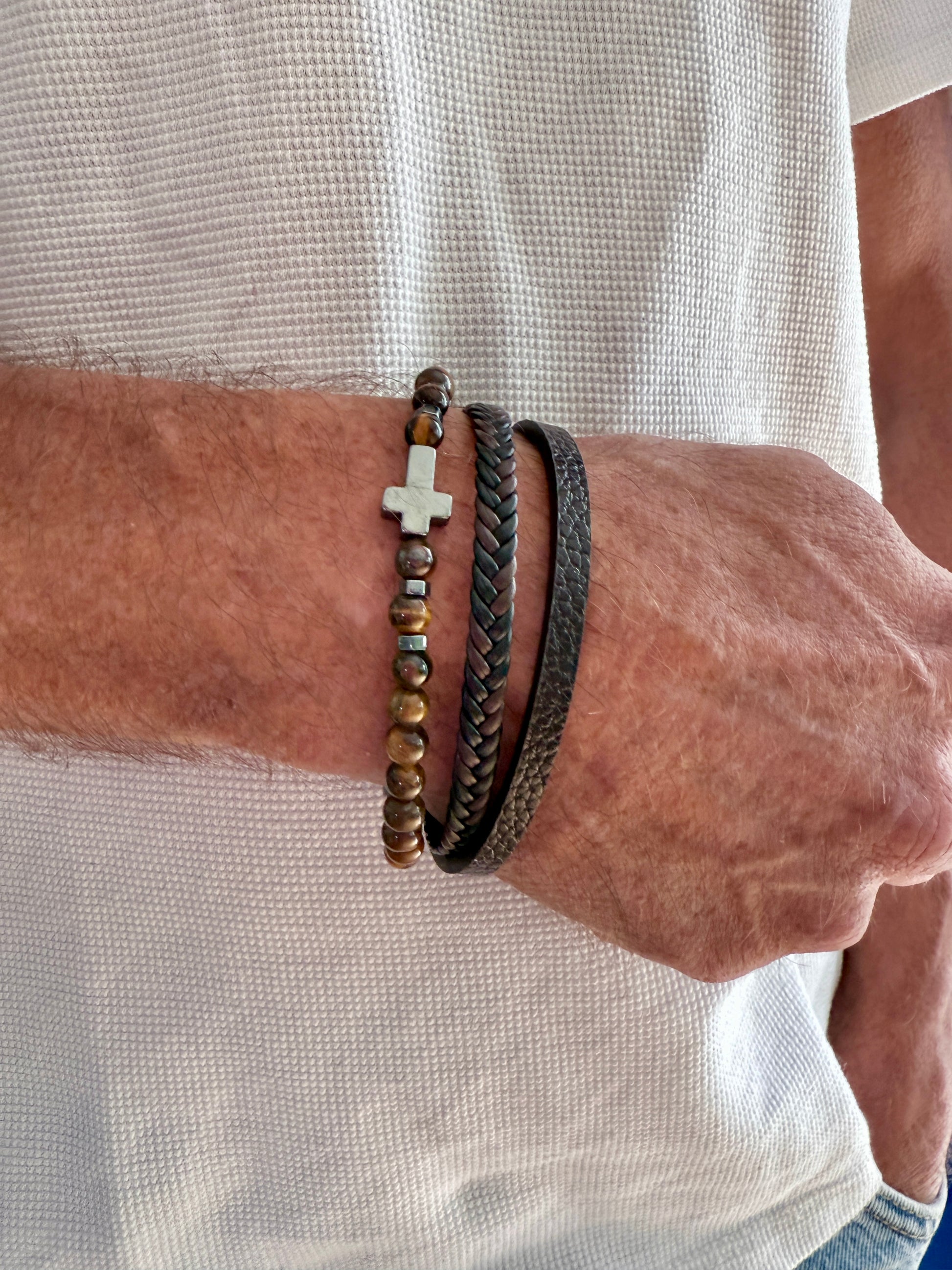 Bracelet triple rangs en simili cuir et pierres naturelles.